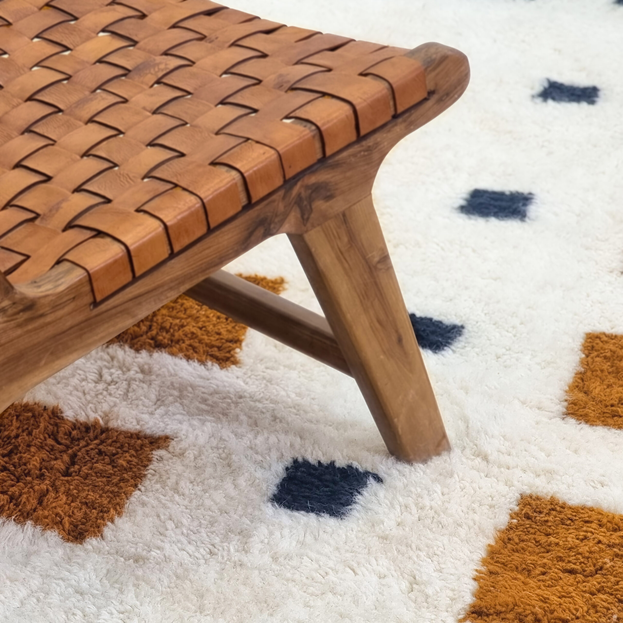 Beni M’Guild rugs are deeply rooted in the cold Middle Atlas winters. Traditionally reversible, they feature dark, moody hues like deep blue and burgundy with bold diamond motifs. Heavy, durable, and full of soul, they are made to warm both homes and hearts.