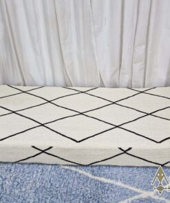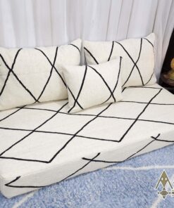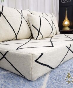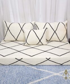 Add a touch of bohemian charm to your home with this exquisite Moroccan handmade white Kilim salon with its unique color combination and motifs, it is ideal for creating a cozy, attractive, and warm area in your home. It also serves those looking for inexpensive salons without the need for opulently expensive ones. This floor couch is refashioned in a our small cooperative atelier from a high quality Moroccan rug which makes it a very solid durable handmade floor sofa.