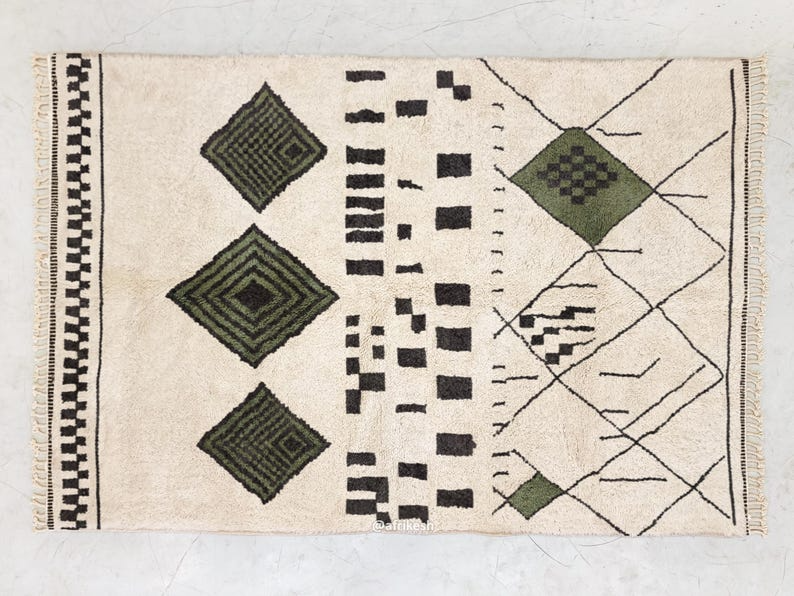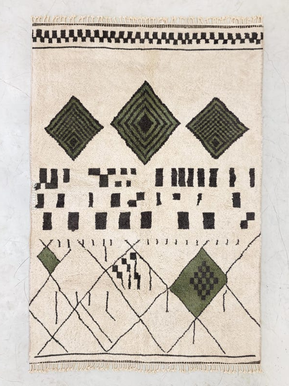 Laleh– Moroccan Beni Ourain Rug Green and White – Custom Geometric Berber Rug
