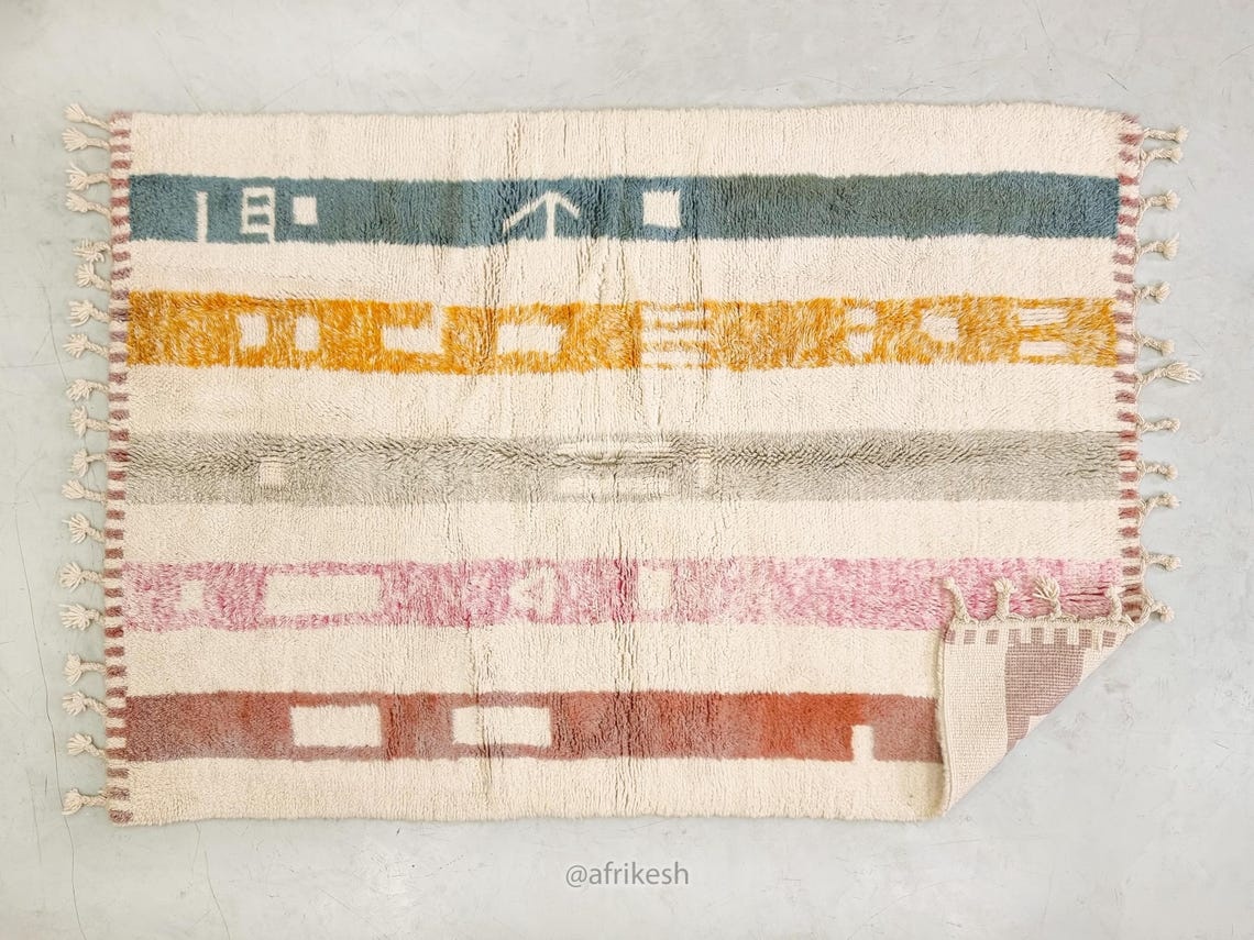 Discover Beni Ourain rugs by Afrikesh, crafted by the Beni Ourain tribe in Morocco's Atlas Mountains. These custom size rugs feature undyed wool and geometric patterns that tell a rich cultural story. With their neutral color palette and traditional craftsmanship, Beni rugs offer both aesthetic appeal and historical significance.