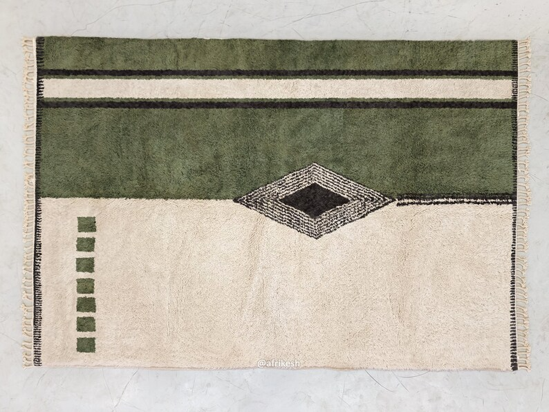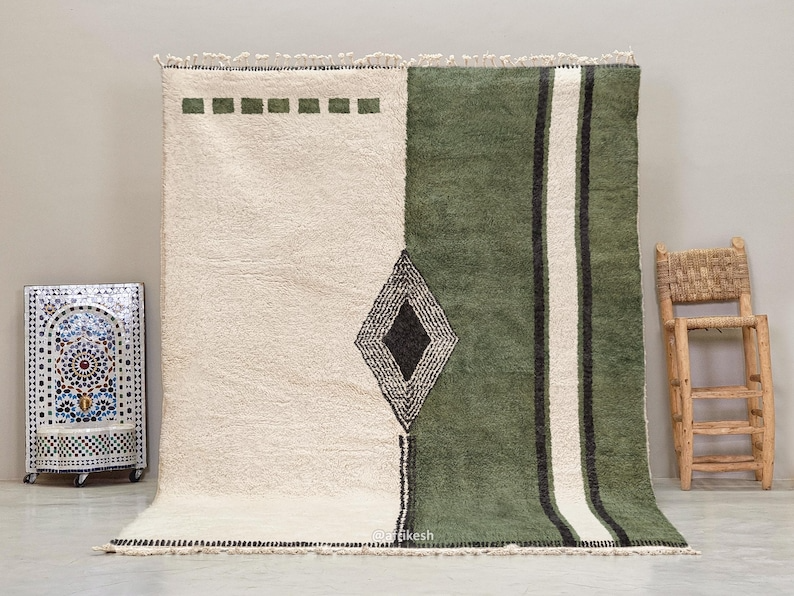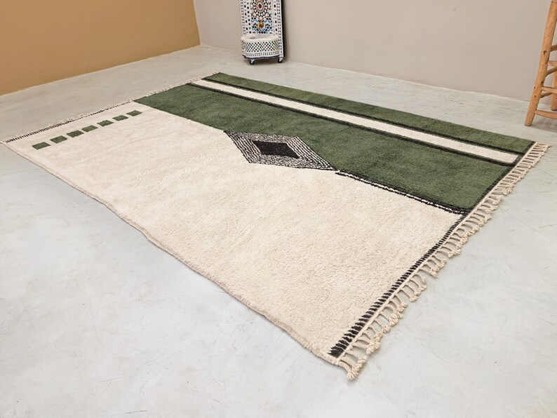 Zayd– Moroccan Beni Ourain Rug Green and White – Custom Geometric Berber Rug